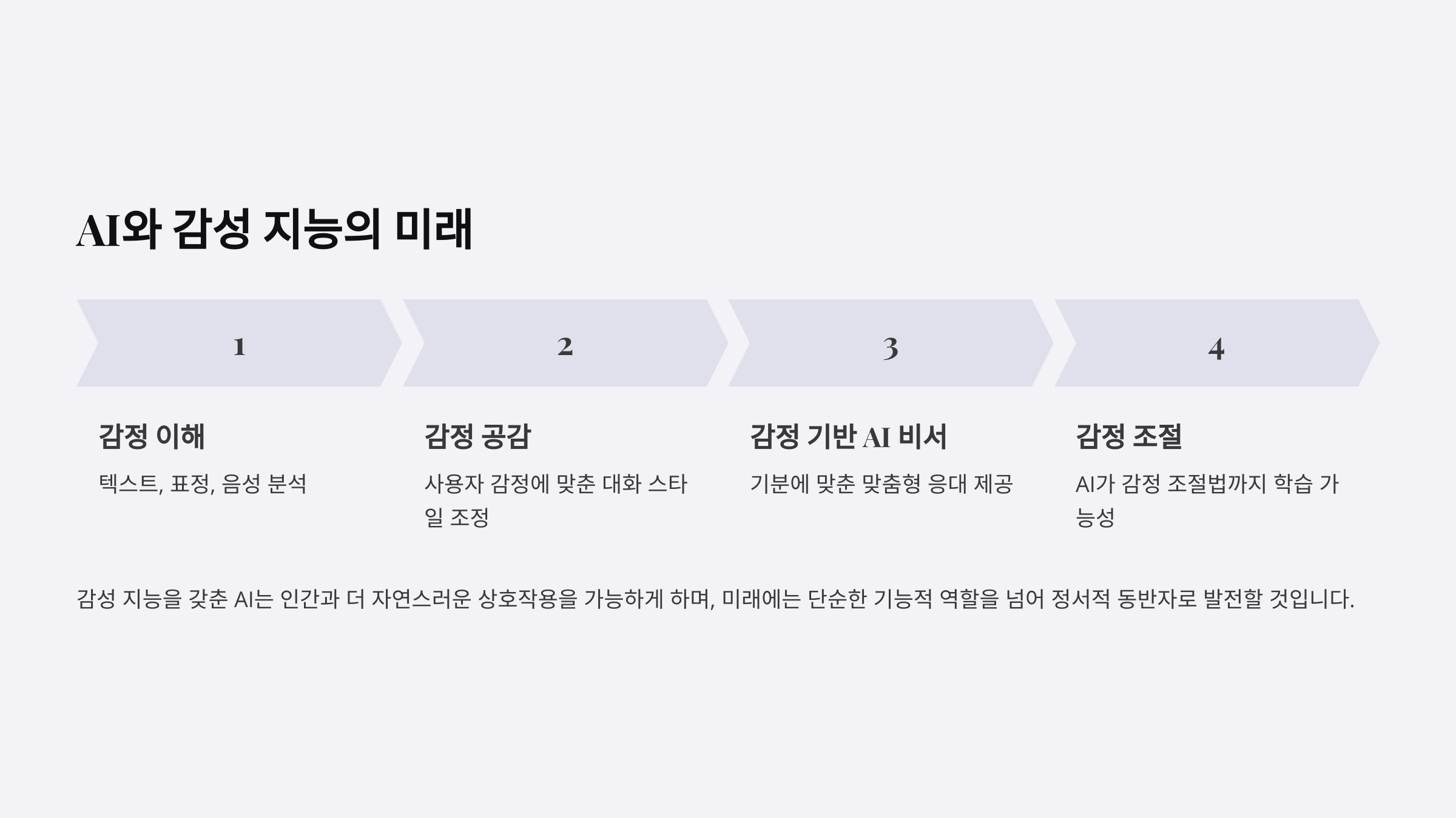 지금 AI는 감정을 이해하는 수준을 넘어 점점 공감하는 단계로 발전하고 있습니다. 앞으로는 AI가 사용자의 감정에 따라 대화 스타일을 조정하는 기능을 갖추고 감정 기반 AI 비서가 등장해 기분에 맞춘 맞춤형 응대를 제공할 수도 있습니다. 나아가 AI가 감정을 조절하는 법까지 배우게 될 가능성도 열려 있습니다.