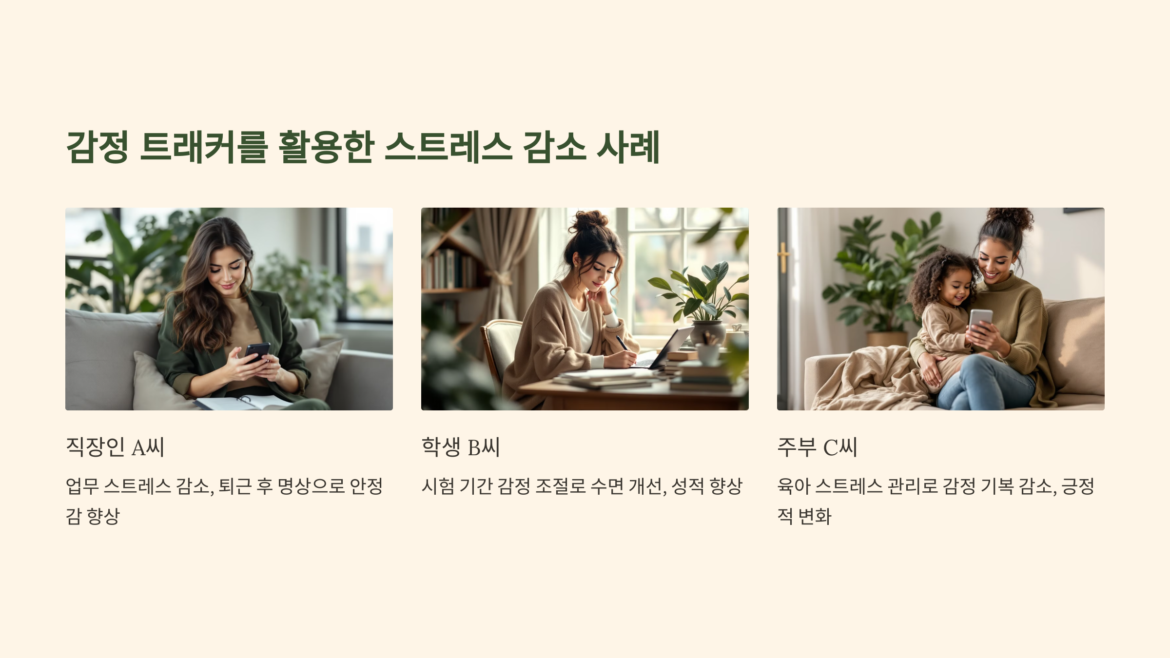 ✅ 주부 C씨 - "집안일과 육아를 병행하면서 감정 기복이 심해지고, 스트레스 관리가 어려웠습니다. 하지만 AI 감정 트래커를 활용하여 감정을 기록하고, AI가 제공하는 맞춤형 조언을 따르면서 감정 조절이 한결 수월해졌습니다. 덕분에 일상 속 작은 변화만으로도 긍정적인 감정 상태를 유지할 수 있게 되었습니다."